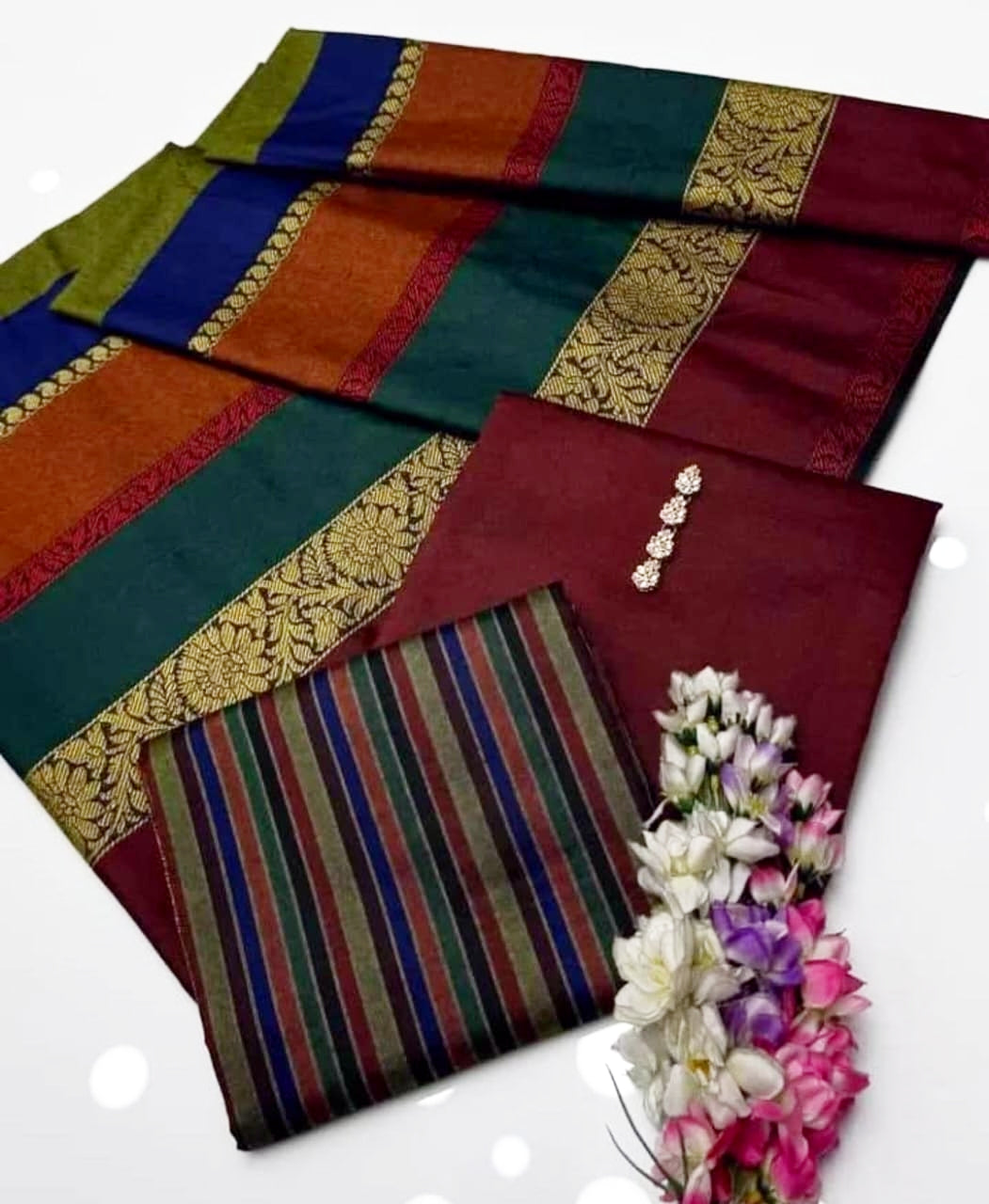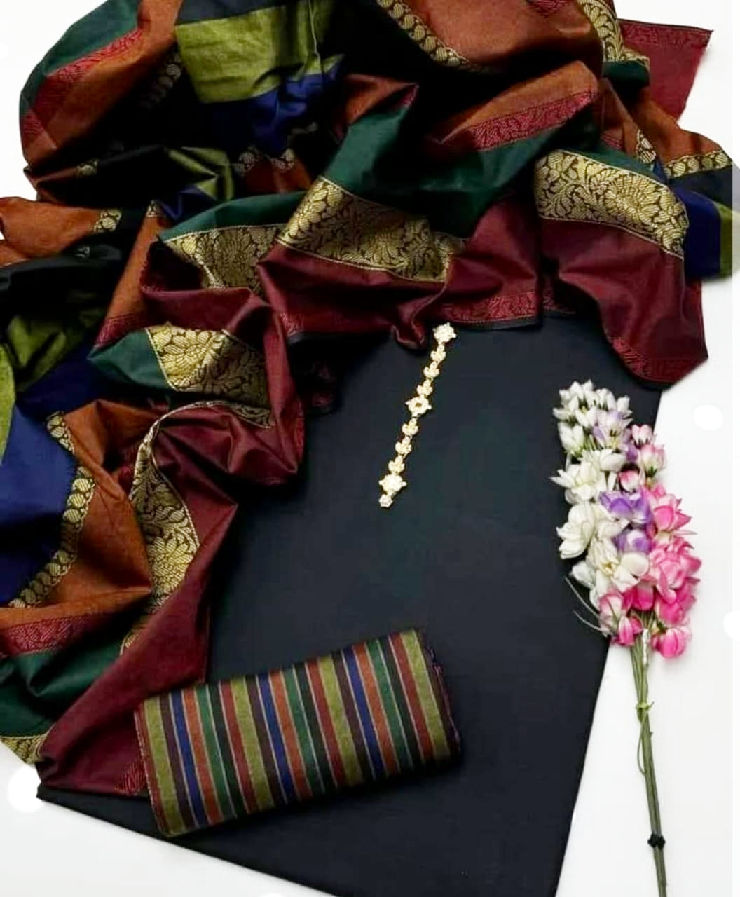 multy banarsi border wool shawl and 3 black buttons